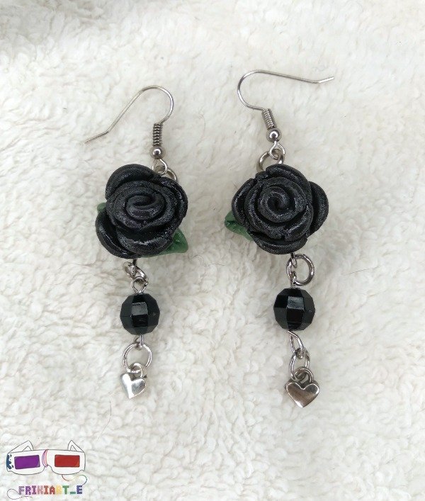 Aros de porcelana fria en forma de rosas negras, hechos artesanalmente. De ellas cuelgan una perla negra brillante y un candado de forma de corazón. Diseño original!