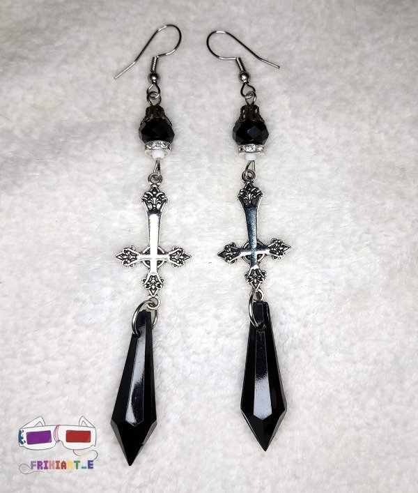 Aros de diseño original, de 7 cm de largo aprox. Son largos. Tienen dijes metálicos de cruces, perlas negras, con un acrílico negro en su terminación. Inspirados en el estilo gótico-victoriano.