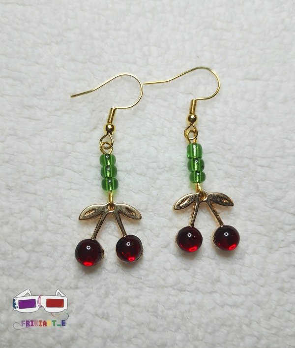 Aros de diseño original, de 4 cm de largo aprox. Tienen mostacillas y dijes de cerezas doradas.