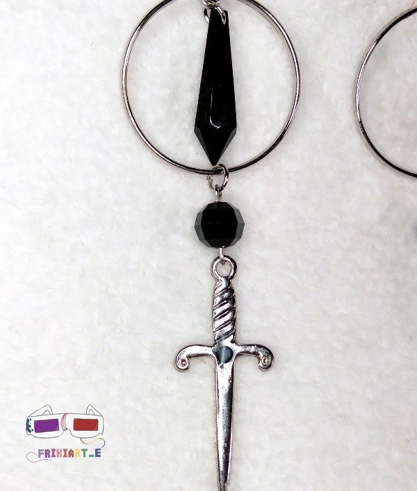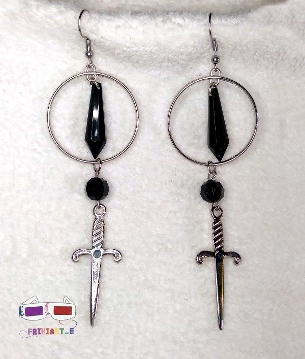 Aros creados artesanalmente con terminación en acero quirúrgico. Contienen una gema acrílica de color negro con un dije de níquel en forma de daga relleno con resina de color negro. Diseño original. Ideales para completar un estilo gótico o darkcore. Son largos, de 6 cm, pero no son pesados. Son muy elegantes y originales.