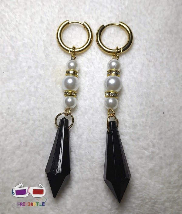 Aros de diseño original, de 6 cm de largo aprox. Inspirados en el estilo Regencia Inglesa. Tienen perlas blancas, detalles brillosos y cristales negros al final. Muy victorianos, son ideales para un traje elegante, son sutiles pero delicados.