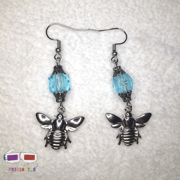 Aros de diseño original, de 4 cm de largo. Inspirado en el estilo de Regencia Inglesa. Tienen un cubo de crital de color celeste y un dije de abeja debajo de niquel. Super delicado y original. Bridgerton-coded, inspirados en el personaje de Eloise.