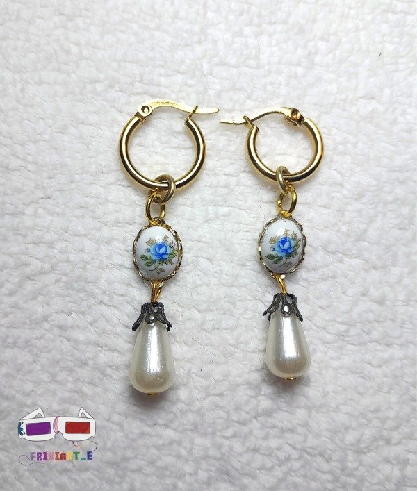 Aros de diseño original, de 4 cm de largo aprox. Inspirados en el estilo Regencia Inglesa. Tienen un camafeo con flores celestes, detalles brillosos y un cristal perlado al final. Muy victorianos, son ideales para un traje elegante, son sutiles pero delicados.