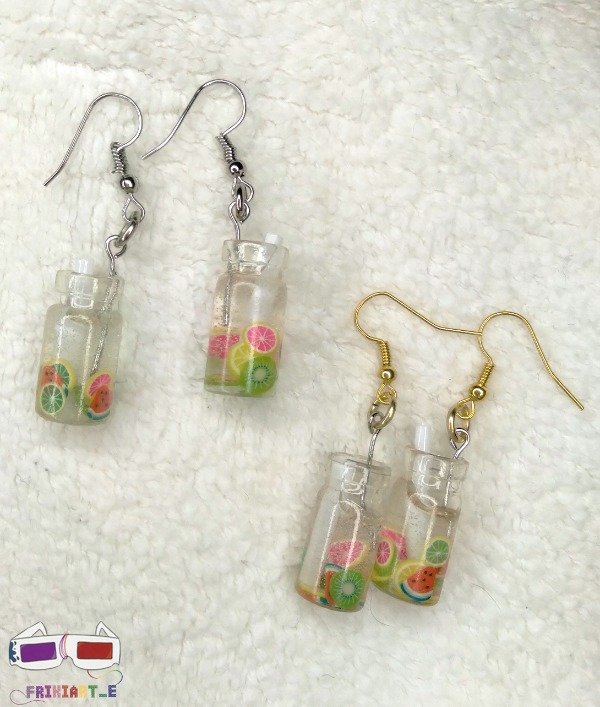 Aros de frasqutios de vidrio rellenos con resina y frutas, hechos artesanalmente. Parecen una bebida fresca de verano con pedazos de sandia/kiwi/pomelo/limon/y lima dentro mezclados. Los ganchitos pueden ser dorados o plateados.
