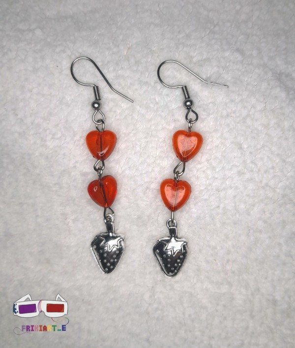 Aros de diseño original, de 5 cm de largo aprox. Tienen corazones rojos y una frutilla plateada en su terminación.