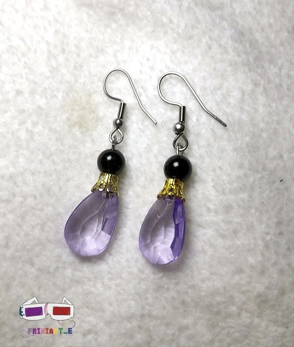 Aros de diseño original, de 3 cm de largo aprox. Tienen una forma simil a un perfume miniatura, tienen una perla, detalles brillosos y terminación con un cristal violeta translucido. Inspirados en el estilo Regencia Inglesa. Jane austen-coded, son ideales para un traje elegante y minimalista, son sutiles pero delicados