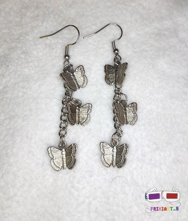 Aros tematicos inspirados en mariposas. Contienen 3 dijes de mariposas colgantes de una cadena de acero quirúrgico. Ideales para combinar con estilo cottagecore o más formal. Sútiles pero creativas. Diseño original. Tienen terminación en acero quirúrgico y son de 6 cm de largo.