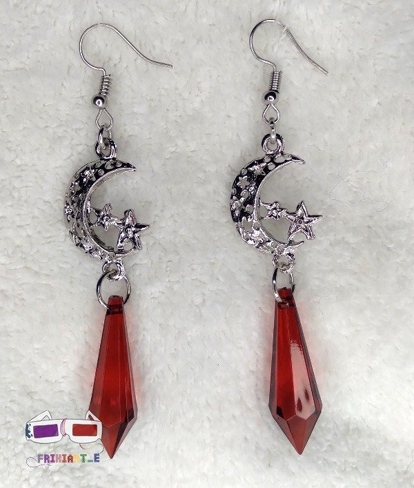 Aros metalicos con un touch super original. Contienen un dije de luna con estrella metalica en la parte superior, seguidos por una gota roja de material plástico. Diseño original, con 8 cm de largo.