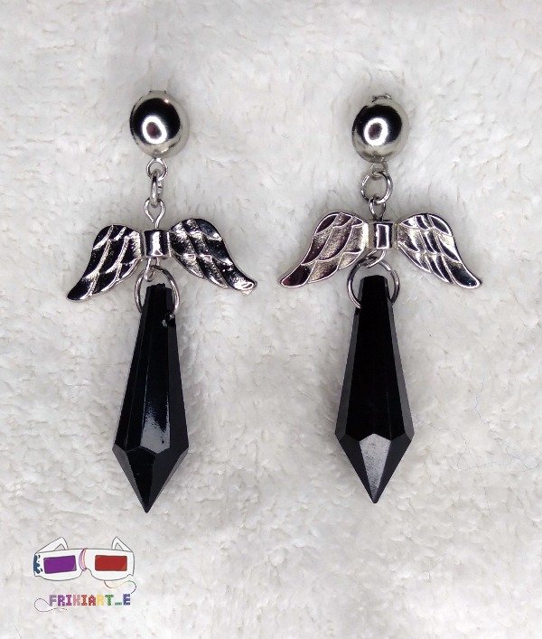 Aros metalicos fijos, ideales para completar un aesthetic fantástico. Contienen un dije de alas en la parte superior (texturado de ambos lados), seguidos por una gota negra de material plástico. Diseño original, con 6 cm de largo.