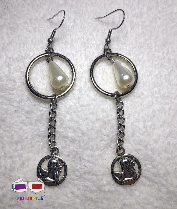 Aros con dijes metalicos en forma de angel y una gota perlada. Diseño original. Tienen terminación en acero quirúrgico y son de 4 cm aprox de largo.