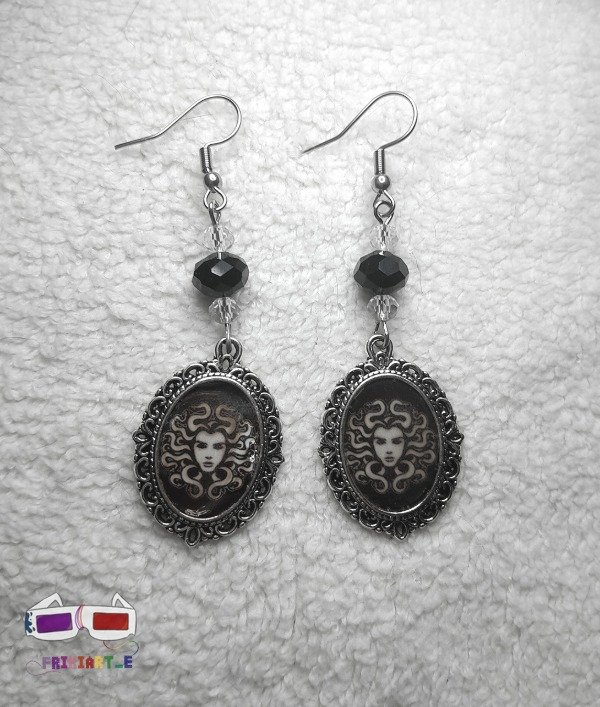 Aros de camafeo creados artesanalmente. Contienen una perla negra seguido por un camafeo con la imagen de Medusa en resina. Dignos para hacerle culto al iconico personaje de la mitología griega. Diseño original, con 6 cm de largo.
