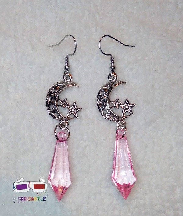 Aros realizados artesanalmente, con dijes de lunas. Debajo contiene una gota de acrílico rosada. Super originales y mágicos. Ideales para un outfit fairy grunge. Son de 7 cm de largo aprox.