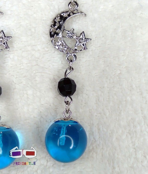 Aros con diversidad de materiales de dijes inspirados en la Titan de la Luna de la mitologia griega. Contienen un dije de luna con estrella metalica en la parte superior, seguidos por una perla negra y una esfera celesta realizada en resina artesanalmente. Dignos para hacerle culto al iconico personaje de la mitología griega. Diseño original, con 8 cm de largo.