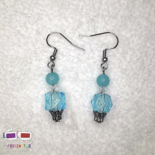 Aros de diseño original, de 3 cm de largo aprox. Tienen una forma simil a un perfume miniatura. Estan armados con una perla de vidrio, perla celeste y terminación con un cubo celeste translucido. Inspirados en el estilo Regencia Inglesa. Jane austen-coded, son ideales para un traje elegante y minimalista, son sutiles pero delicados