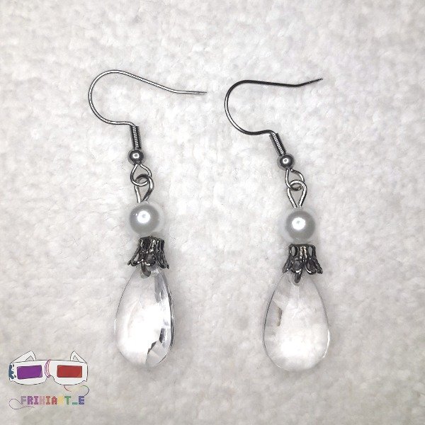 Aros de diseño original, de 3 cm de largo aprox. Inspirado en el estilo de Regencia Inglesa. Tienen una perla en color blanca y un dije en forma de gota transparente en su final. Bridgerton-coded. Ideal para combinar con un atuendo elegante, sútiles pero delicados y originales.
