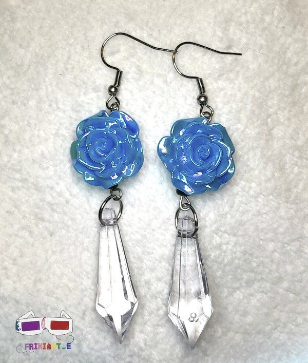 Aros acrílicos con terminación en acero quirúrgico. Contienen dijes en formas de rosas plásticas tornasoladas, terminando el diseño con un dije acrílico de color transparente. Ideales para combinar con muchos estilos. Diseño original. Tienen aprox 6 cm de largo. No son pesados. Son muy elegantes y originales.
