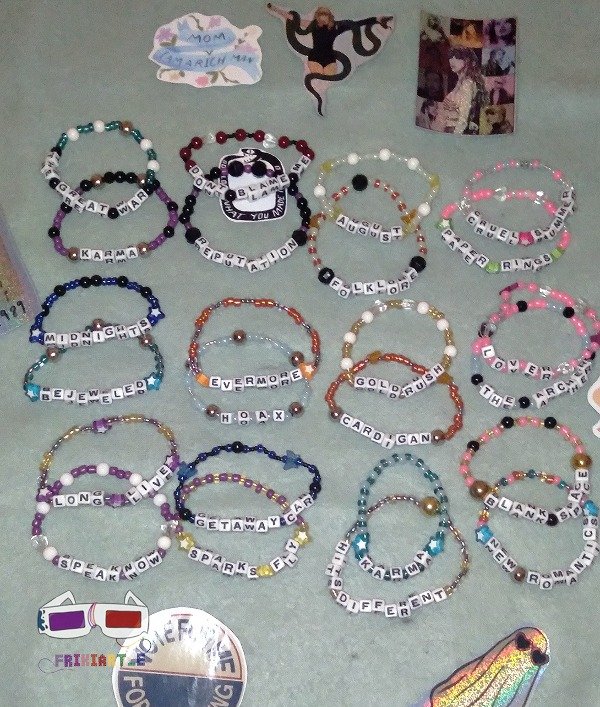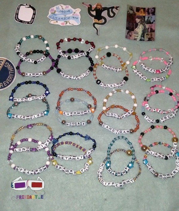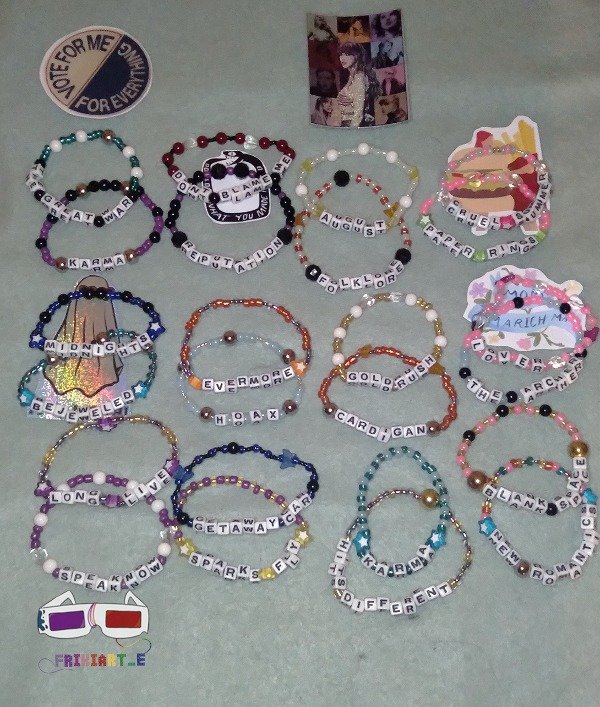 Pulseras realizadas en tanza elástica con mostacillas variadas tematicas de diversas canciones de Taylor Swift. Tienen aproximadamente 16 cm de largo, pero se estiran mucho.