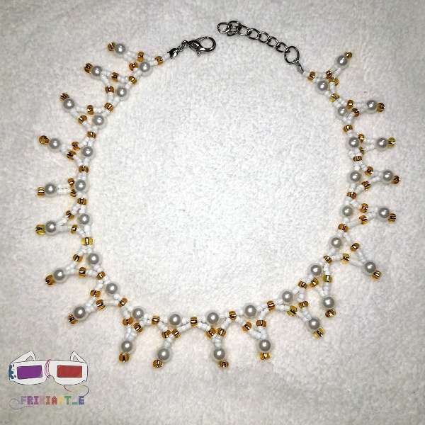 Collar realizado en mostacillas doradas, blancas y perlas blancas de distintos tamaños. Armado artesanal con tanza elástica, es de 40 cm de largo aprox, con largo regulable. Inspirado en la época de Regencia Inglesa. Se utiliza en estilo choker no muy ajustado al cuello. Bridgerton-coded. Supere elegante, delicado y brillante.