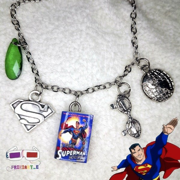 Pulsera de cadena con dijes temáticos inspirados en la película "Superman". Contiene 4 dijes que hace referencias a la historia, incluyendo un pequeño libro realizado en decoupage que tiene la portada del libro de ambos lados y un cristal. Los dijes dependen del stock pero son siempre con la misma idea.