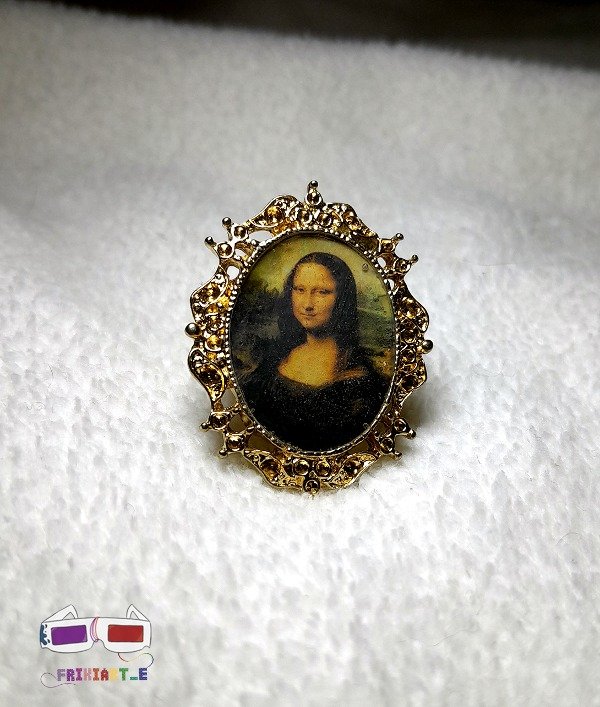 Anillo de metal dorado con un camafeo de 1,5 cm de largo con la famosa pintura "La Gioconda" de Da Vinci. Tiene un estilo victoriano super original e único, ya que es realizado de forma artesanal en resina.