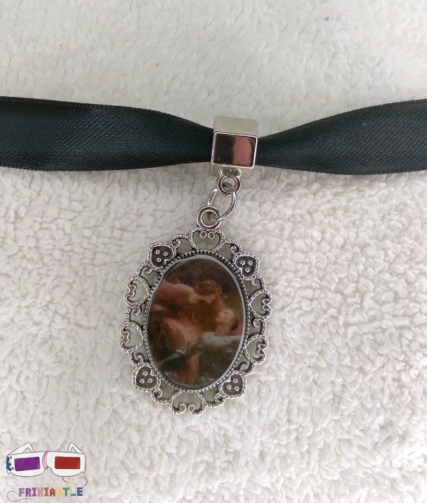 Choker artesanal de cinta gruesa de doble faz con camafeo de fantasía que contiene la pintura "La belle dame sans merci" (La bella dama sin piedad) de Frank dicksee, es una clásica pintura victoriana. El camafeo esta realizado en resina artesanalmente. Contiene terminación con cadena y mosquetón.