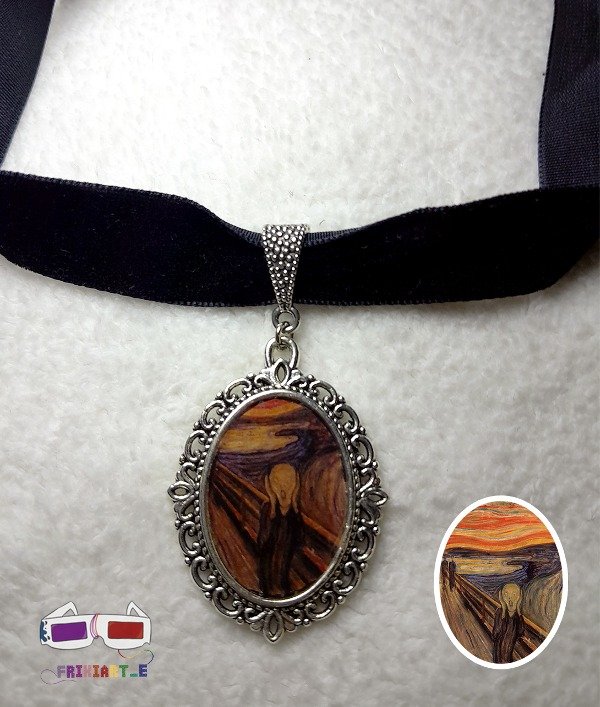 Choker artesanal de cinta gamuzada con camafeo de fantasía que contiene la pintura "El Grito" de Edvard Munch, es una clásica pintura del expresionismo. El camafeo esta realizado en resina artesanalmente. Contiene terminación con cadena y mosquetón.