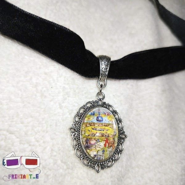 Choker artesanal de cinta gamuzada marron con camafeo de fantasía que contiene la pintura "El jardin de las delicias" de El Bosco. El camafeo esta realizado en resina artesanalmente. Contiene terminación con cadena y mosquetón.