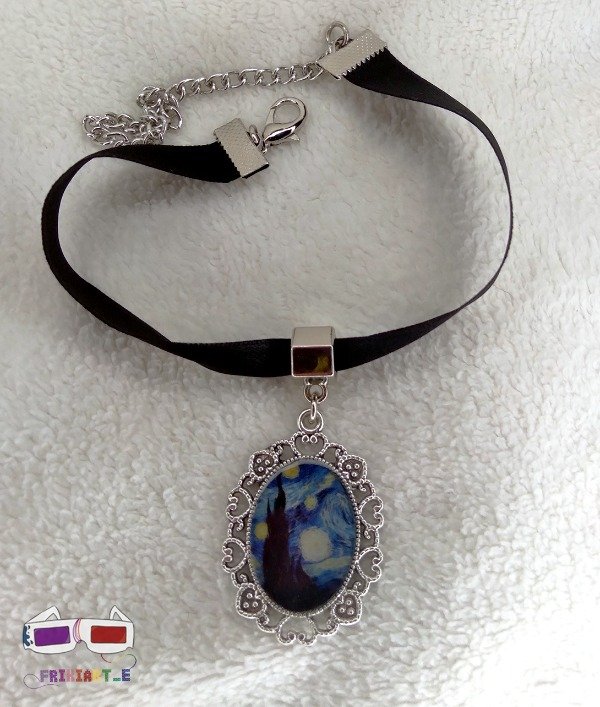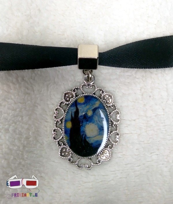 Choker artesanal de cinta gruesa de doble faz con camafeo de fantasía que contiene la pintura "Noche Estrellada" de Vincent Van Gogh, es una clásica pintura del postimpresionismo. El camafeo esta realizado en resina artesanalmente. Contiene terminación con cadena y mosquetón.